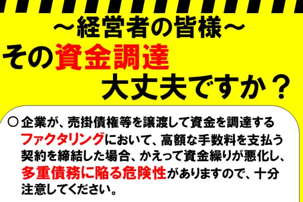 - 金融庁の注意喚起 → 「債権の買取代金が著しく低額」「償還請求権(返済義務)あり」「強引な取り立て」など、偽装ファクタリングの特徴を挙げて警告。